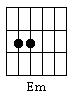 Det här är ett E moll-ackord. För att få ett mollackord sänker man tersen ett halv tonsteg. Vi får treklangen grundton (E), liten ters (G) och kvint (B). Vi såg i durackordet att tersen bara finns på G-strängen. Alltså sänker vi G# till G. För övrigt är ackordet identiskt med det föregående.