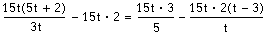 Här ser du att m.g.n. = 15t. Den första termen innehåller ett binomen. Det sätter du inom parentes. Den sista termen däremot innehåller redan en parentes. Där behöver du naturligtvis inte sätta någon ytterligare parentes. Sedan ska du alltså multiplicera samtliga termer med 15t, även 2, 3/5 och den sista termen.