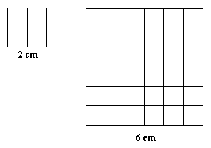 Här har kvadraterna sidorna 2 respektive 6 cm. Om den lilla kvadraten betraktas som föremål och den stora som bild blir längdskalan 3:1.